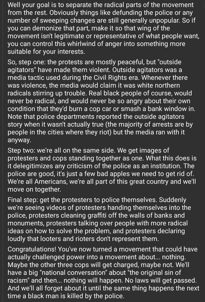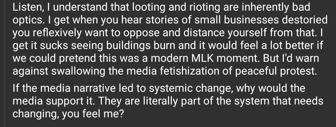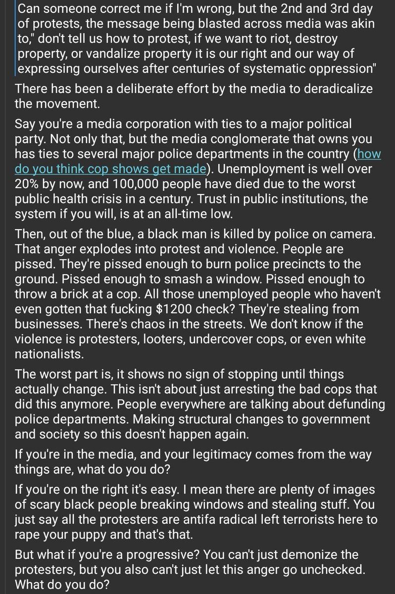I posted this on Reddit but I thought it would work here too. Trying to explain why the media focus on peaceful protest is a deliberate attempt to deradicalize this moment