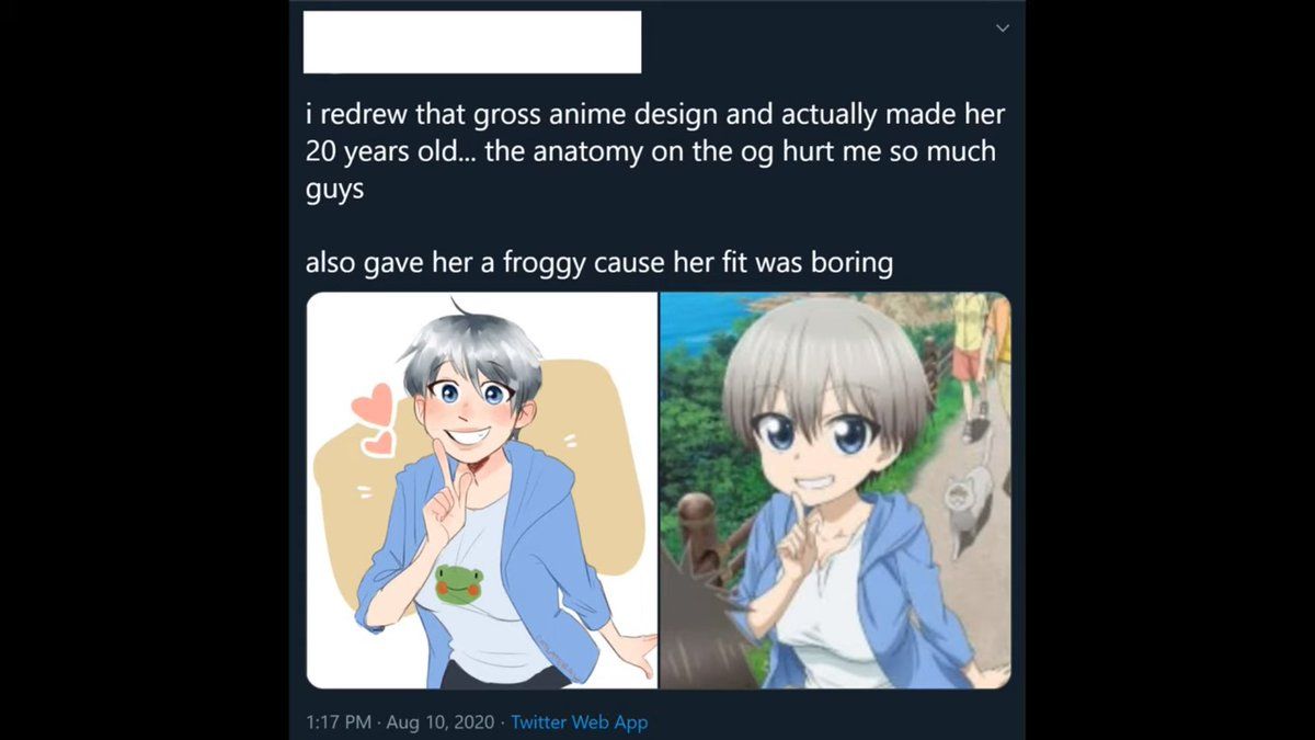 Pretty sure PedanticRomantic did a whole thing on this second one so I won't rehash that conversation. TL;DR the account boosting this is fake lmao. And if it weren't fake, the design itself is fine. A more experienced artist could make chub!Uzaki look cute as hell