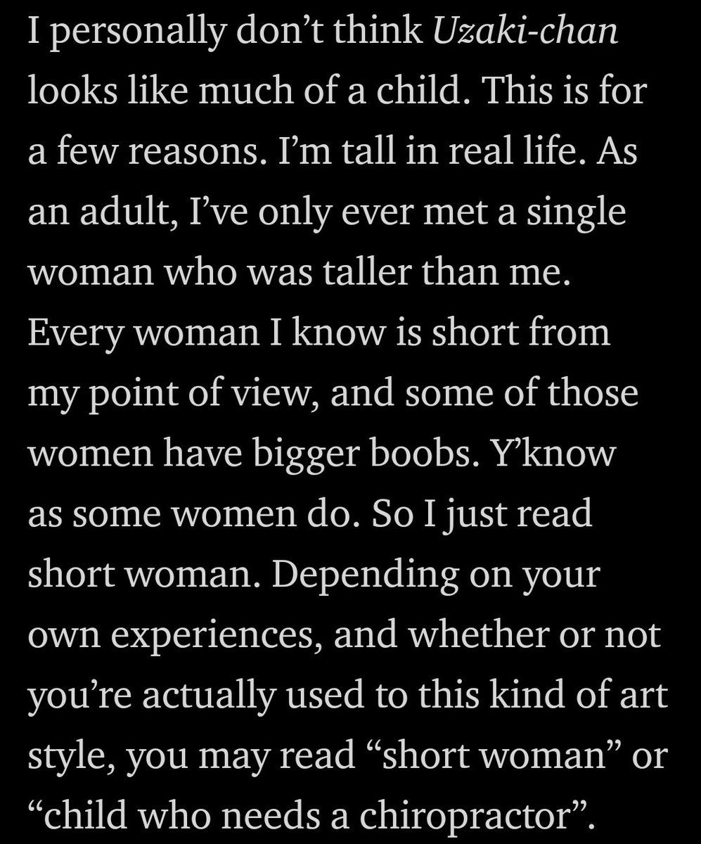 I even explicitly reject the idea that Uzaki-chan necessarily looks like child, or that that should be the main contention of the show.