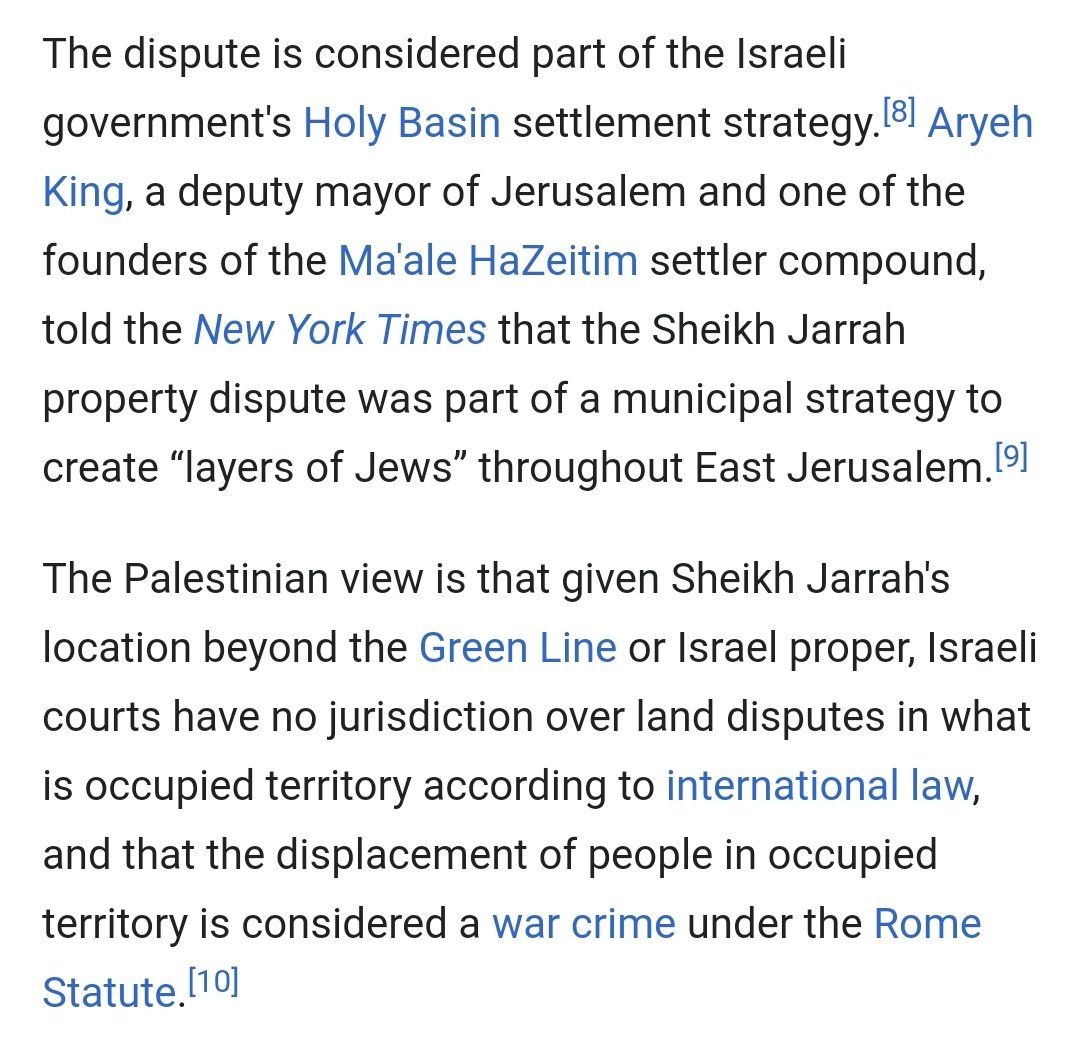 @TheePill @npinnau @thehill No. Israeli courts allow Jews to claim ownership of land in occupied territory, including East Jerusalem, but deny equally valid claims from Palestinians. The Israeli government's stated goal is to replace the population of the neighborhood with Jews en.wikipedia.org/wiki/Sheikh_Jarrah_property_dispute