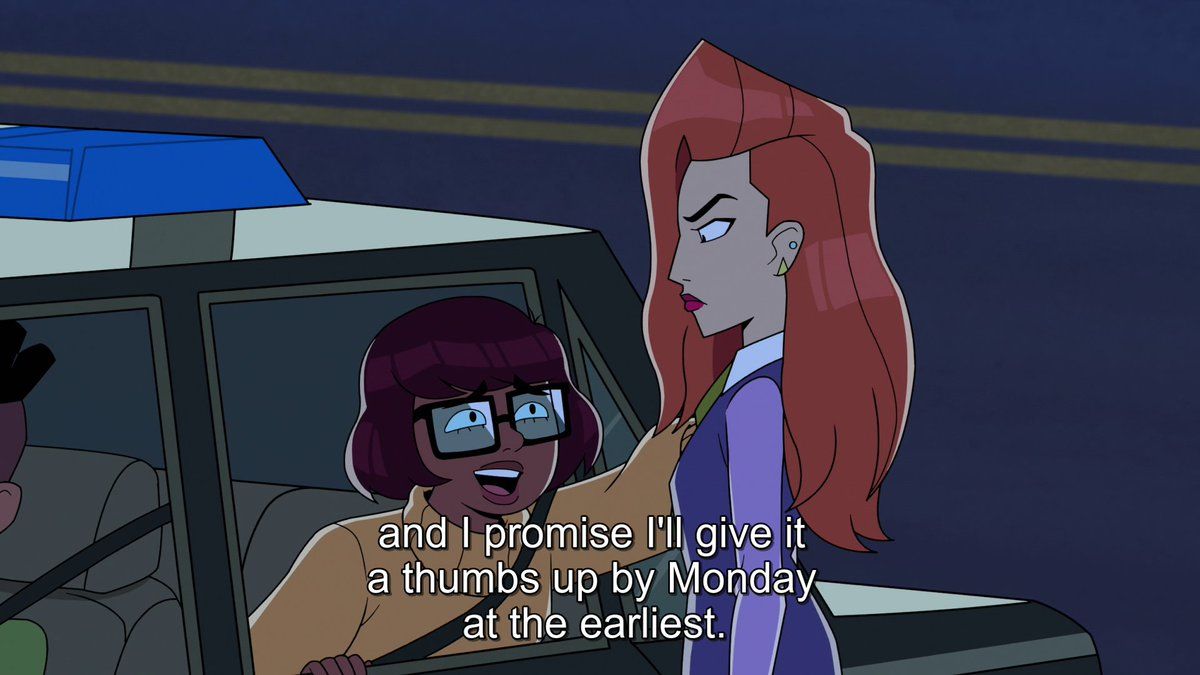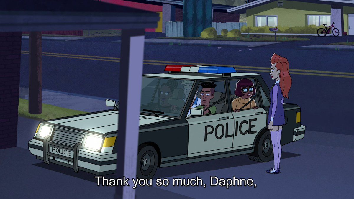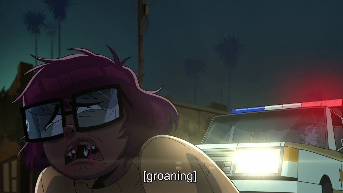 CN: Velma episode 5 After the 2020 protests for Black lives, media around cops should be more socially conscious. That's why we'll have Velma get run over by a cop car for laughs